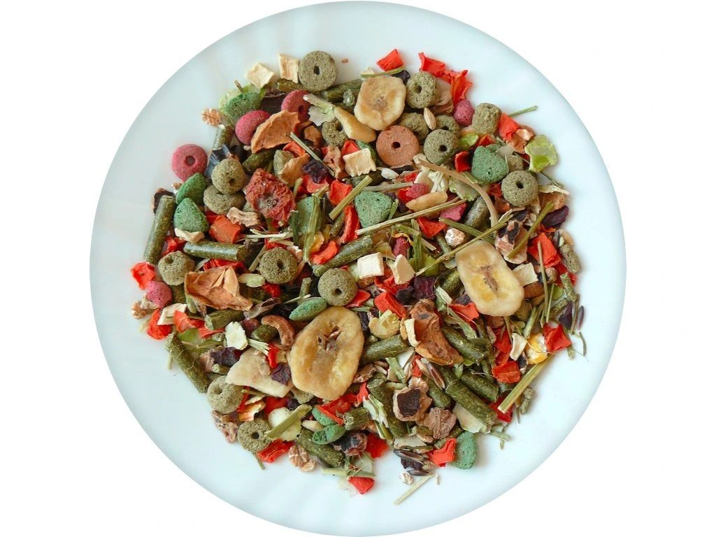 Slložení:Vojtěška, kukuřičné vločky, hrachové vločky, svatojánský chléb, extrudované obiloviny, mrkev, oves celý, kukuřice, banány, pšenice, mrkev