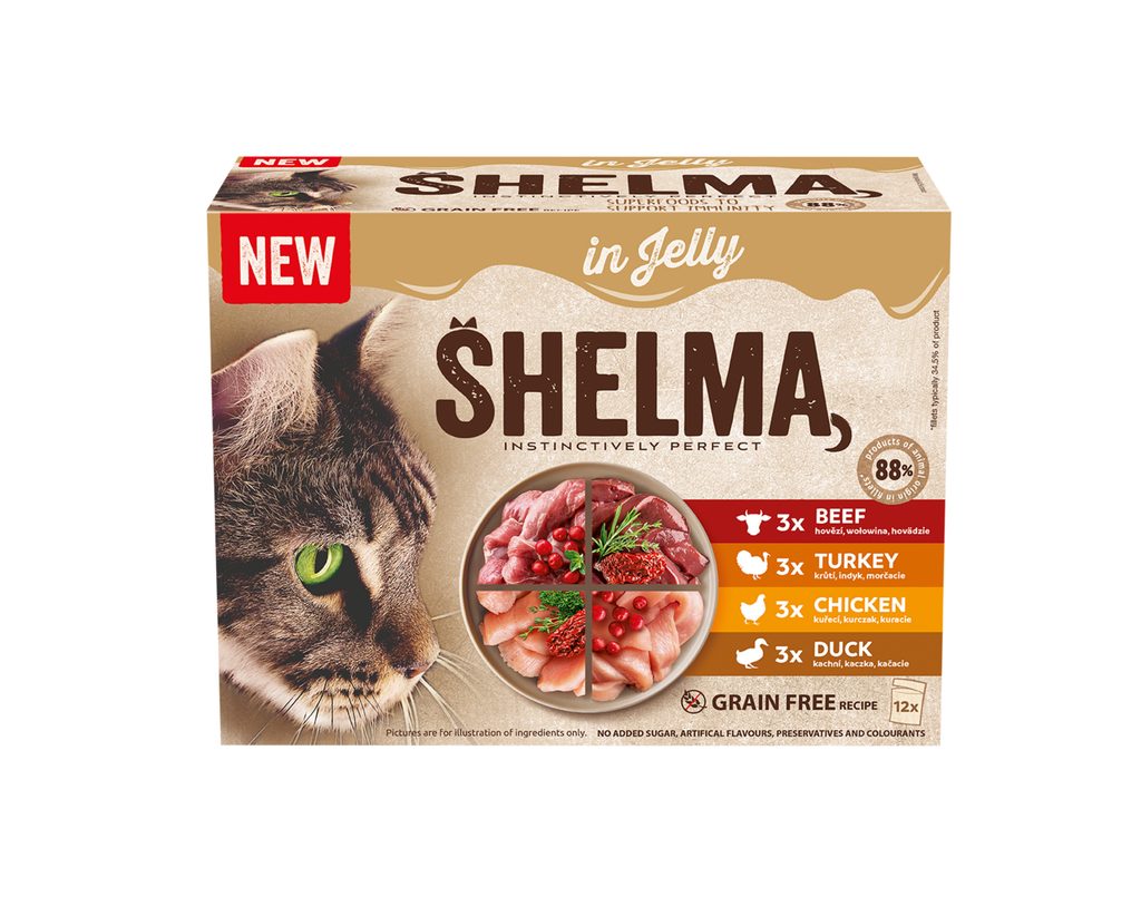 Balení obsahuje: 3 × kapsička hovězí s rajčaty, rozmarýnem a tymiánem 85 g, 3 × kapsička kachní s brusinkami 85 g, 3 × kapsička kuřecí s brusinkami 85 g a 3 × kapsička krůtí s rajčaty, rozmarýnem a tymiánem 85 g.
