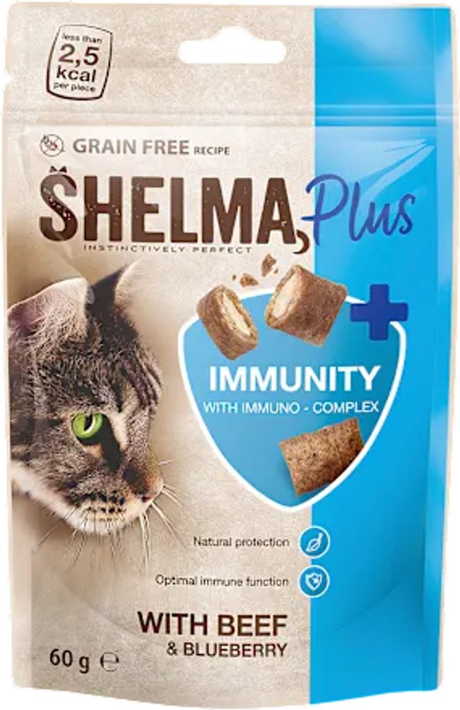 Shelma Plus Immunity bezobilné polštářky pro kočky s hovězím a borůvkami je doplňkové krmivo pro dospělé kočky. Díky svému složení s Pro-Immuno komplexem a aktivní ingrediencí Yang podporuje sílu imunitního systému. Navíc je receptura bez obilovin, barviv, přidaných cukrů, GMO a hypoalergenní. Jeden polštářek obsahuje <2.5 kcal. Udělejte vašemu domácímu mazlíčkovi radost a dopřejte mu bezobilné polštářky od značky Shelma na kterých si zaručeně pochutná.