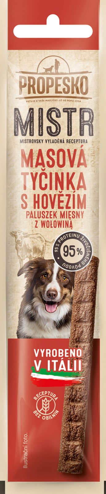 Propesko Mistr Masová tyčinka je lahodným pamlskem pro psy s vysokým obsahem masa a živočišného proteinu. Všechny naše pamlsky jsou vyrobeny v Evropě, konkrétně v italské Città di Castello.