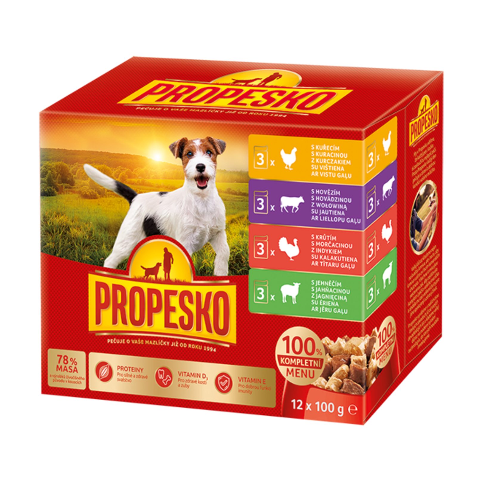 Kompletní krmivo pro dospělé psy. Kapsička 12x100 g s kuřecím, s hovězím, s krůtím, s jehněčím v omáčce.