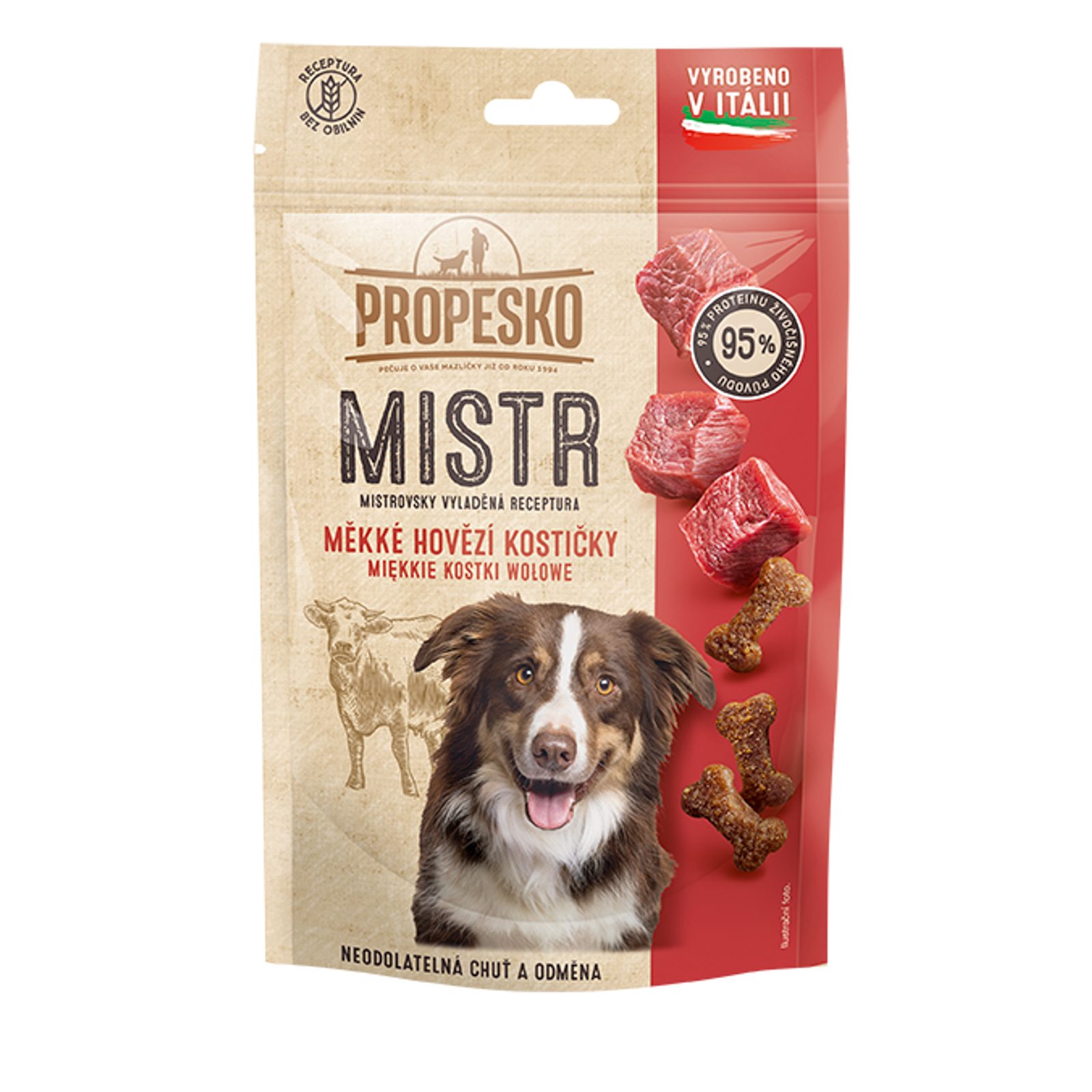 Složení: maso a výrobky živočišného původu (min. 60 %, z toho hovězí min. 8 %), vedlejší výrobky rostlinného původu, oleje a tuky, propylenglykol