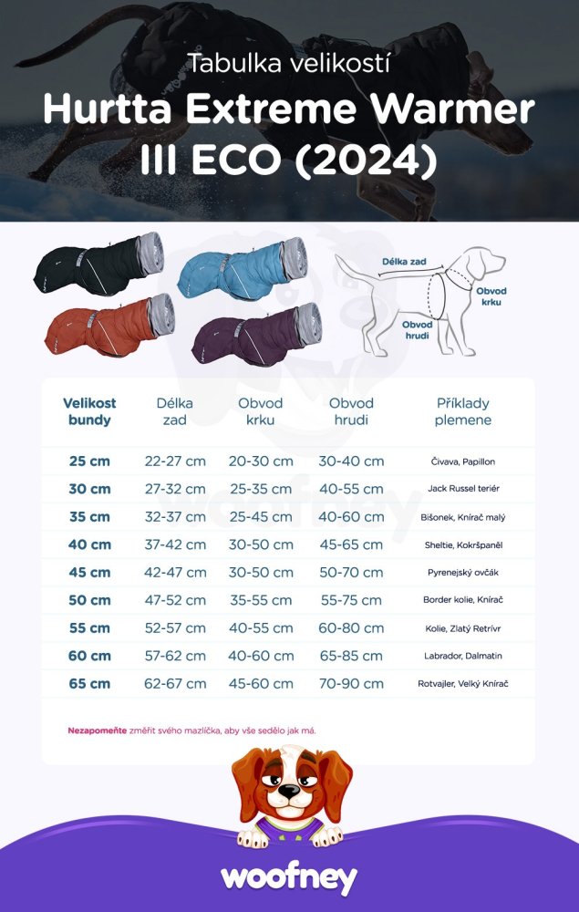 Extreme Warmer III ECO se snadno obléká a je plně nastavitelný, takže je vhodný pro psy různých velikostí a plemen. Je ideální pro krátkosrsté psy, psy bez podsady, ale i pro starší a nemocné psy, kteří potřebují zvláštní péči v chladném počasí. Kapuce bundy chrání krk, uši i hlavu psa, zatímco vnitřní nastavovací prvky a chytře navržený lem umožňují přizpůsobit bundu aktuálním potřebám.