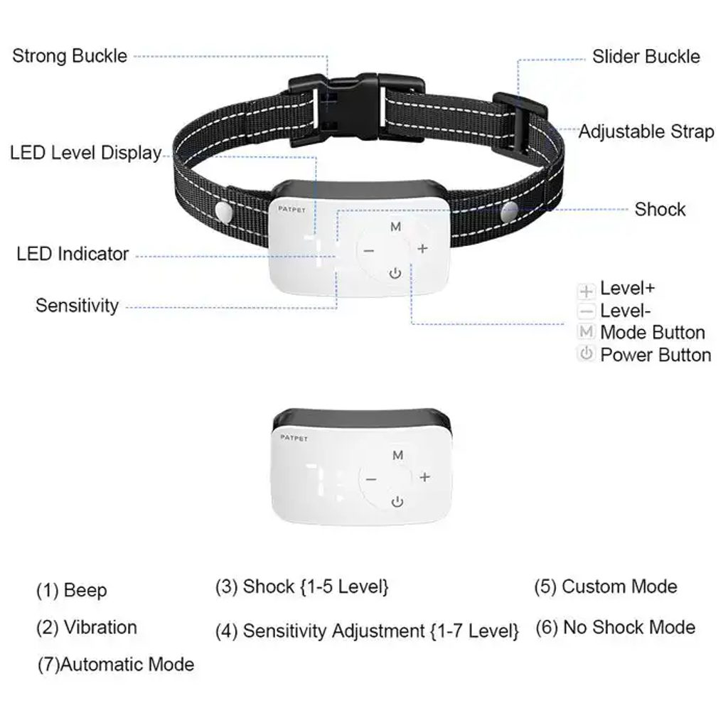 Patpet BC01 je inteligentní protištěkací obojek navržený pro bezpečné a citlivé odnaučení nežádoucího štěkání. Nabízí kombinaci tří typů korekcí – zvuku, vibrací a impulzu – s možností individuálního nastavení i provozu bez elektrostatické stimulace. Díky novému čipu pro rozpoznání štěkání, rychlému USB-C nabíjení a dlouhé výdrži až 10 dní je skvělou volbou pro majitele středních a velkých psů.