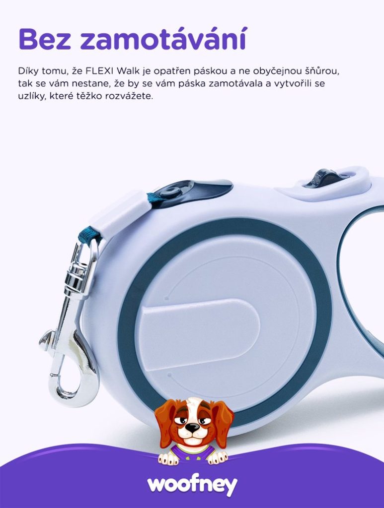 _x000D_ Díky tomu, že FLEXI Walk je opatřen páskou a ne obyčejnou šňůrou, tak se vám nestane, že by se vám páska zamotávala a vytvořili se uzlíky, které těžko rozvážete._x000D_