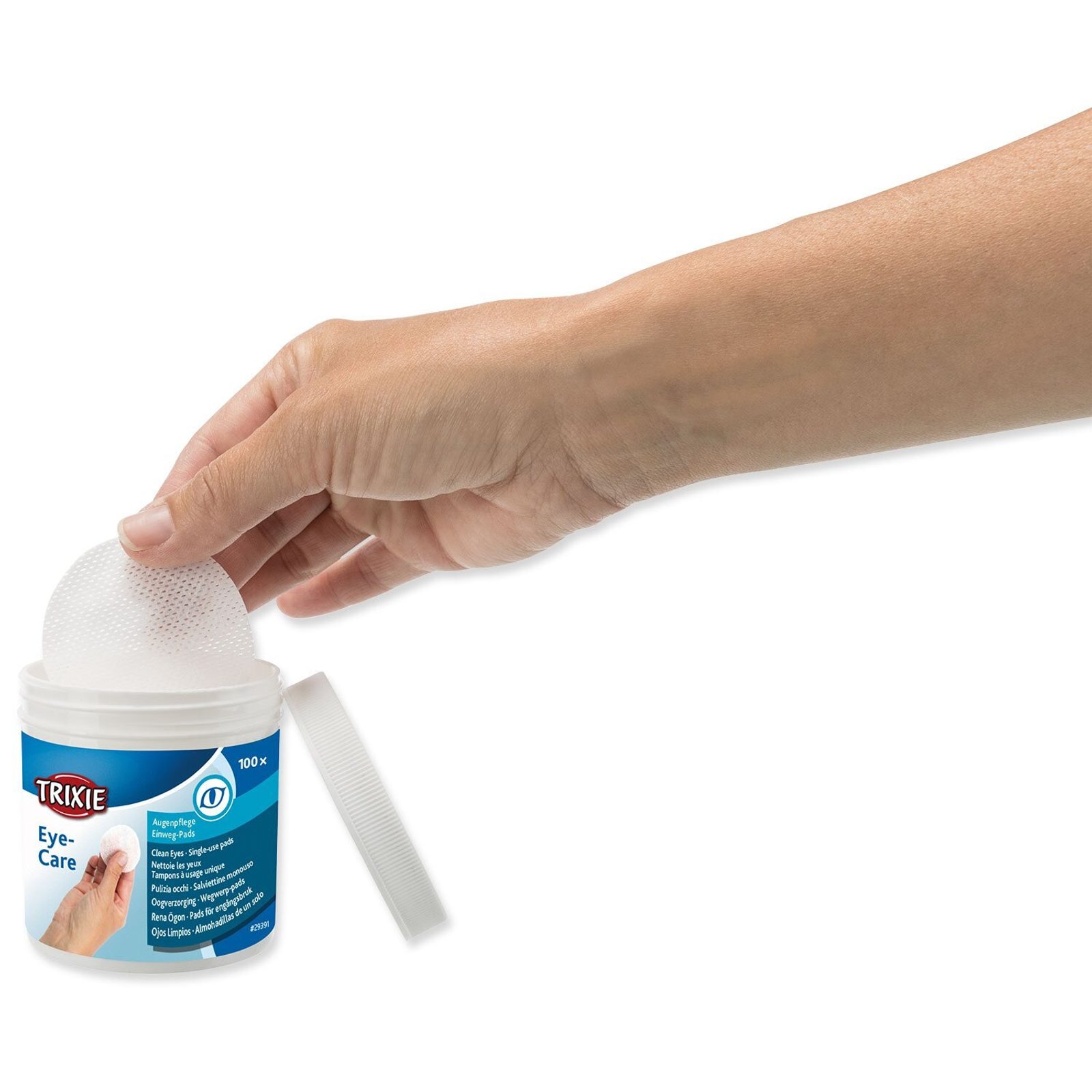 Tento balíček obsahuje 100 kusů jednorázových polštářků navlhčených speciálním čisticím roztokem s aloe vera a provitaminem B5, který jemně čistí oči a okolí očí, odstraňuje prach, nečistoty i alergeny a současně ošetřuje a zklidňuje citlivou pokožku. Použití je velmi jednoduché - každý tampon slouží na jedno oko, stačí jemným pohybem očistit zavřené víčko či oční okolí vašeho zvířete.